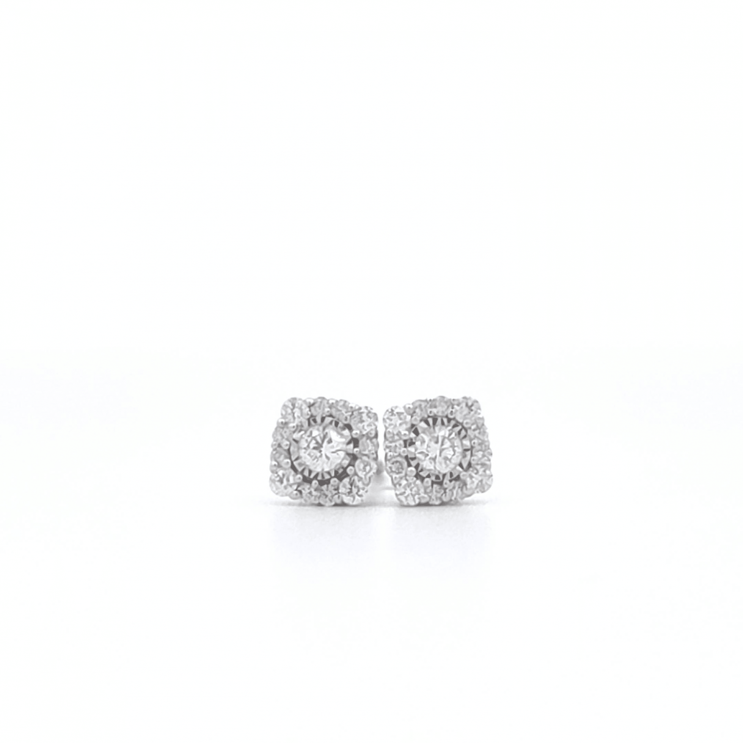 The design creates a cushion shaped silhouette, offering a modern twist on the classic diamond earring, perfect for everyday luxury.