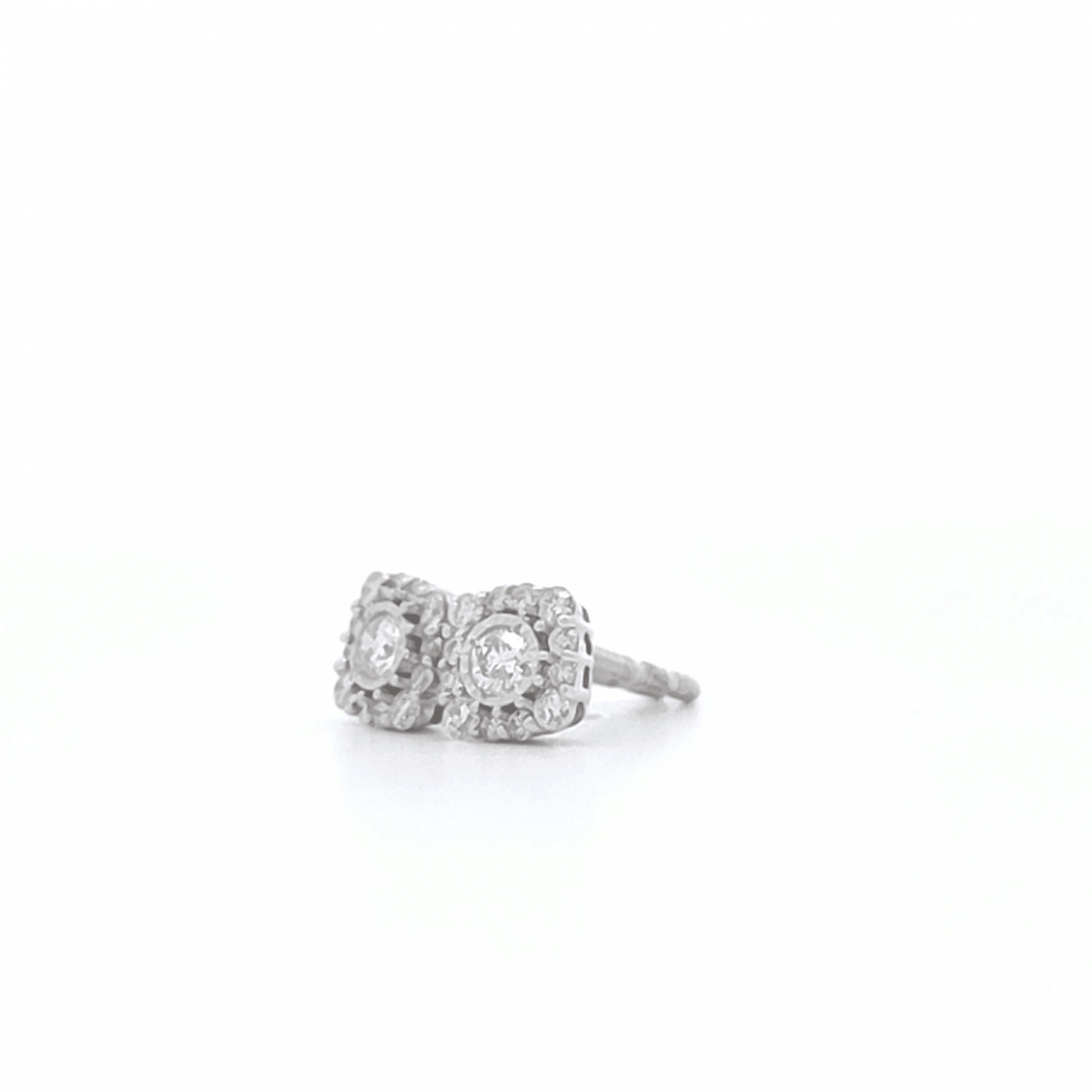 These are stunning 9ct white gold earrings, each featuring a central diamond encircled by a halo of smaller diamonds.