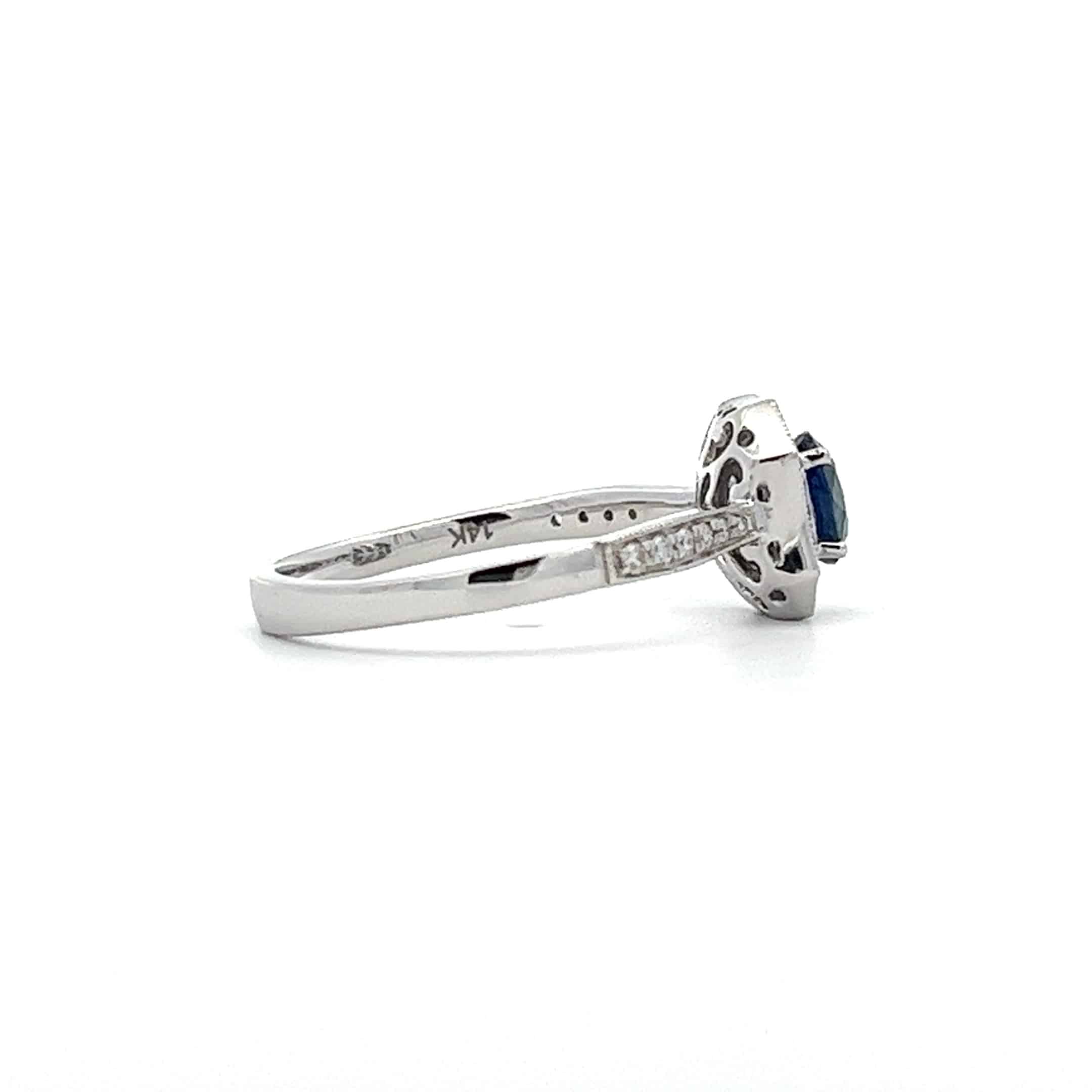 This platinum vintage design cluster ring, is set with a beautiful coloured central blue sapphire and surrounded by grain set diamonds, with diamond set shoulders.