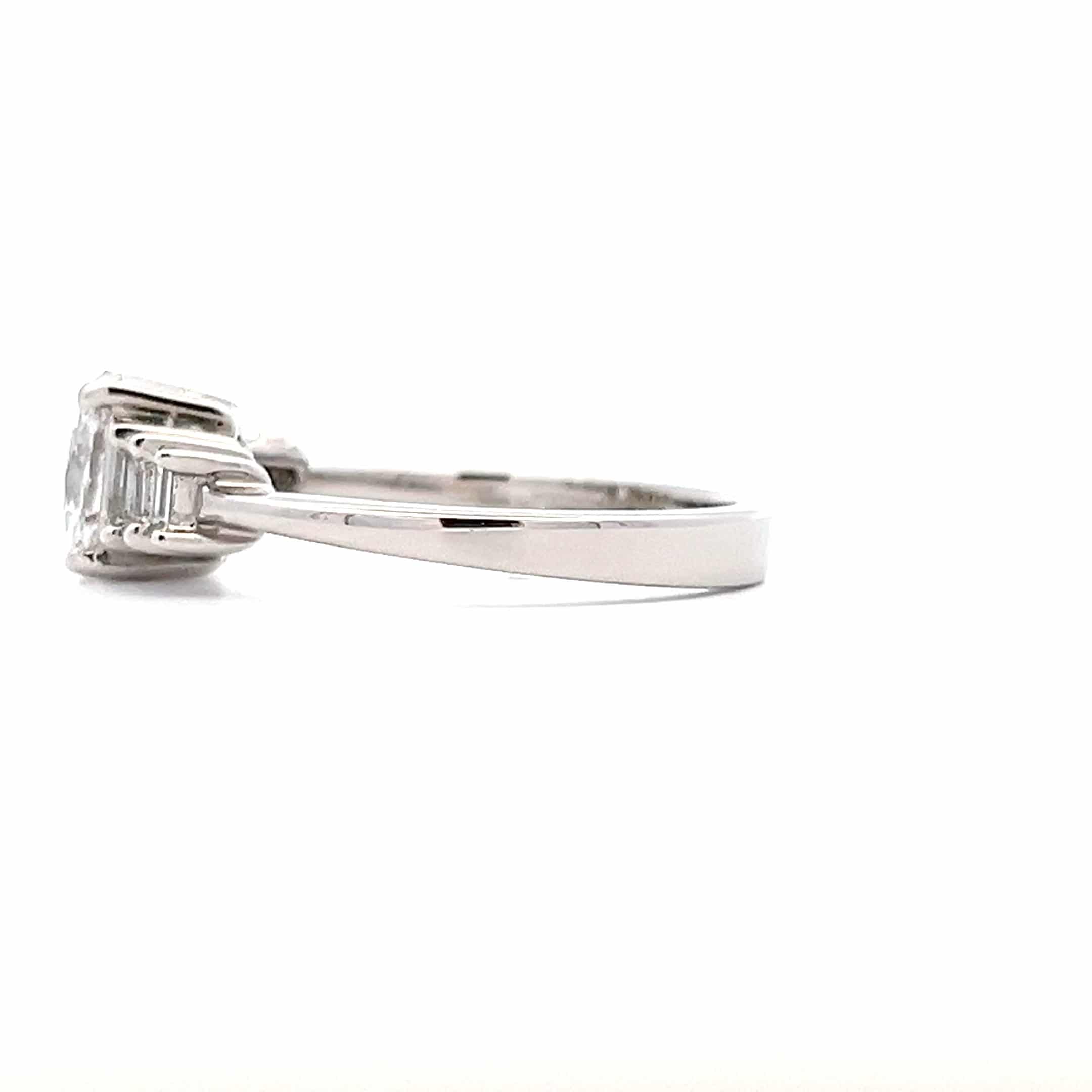 This beautiful Diamond half hoop ring is set with a central GIA certificated oval Diamond in a four claw setting and finished 3 baguette cut Diamonds to either side.