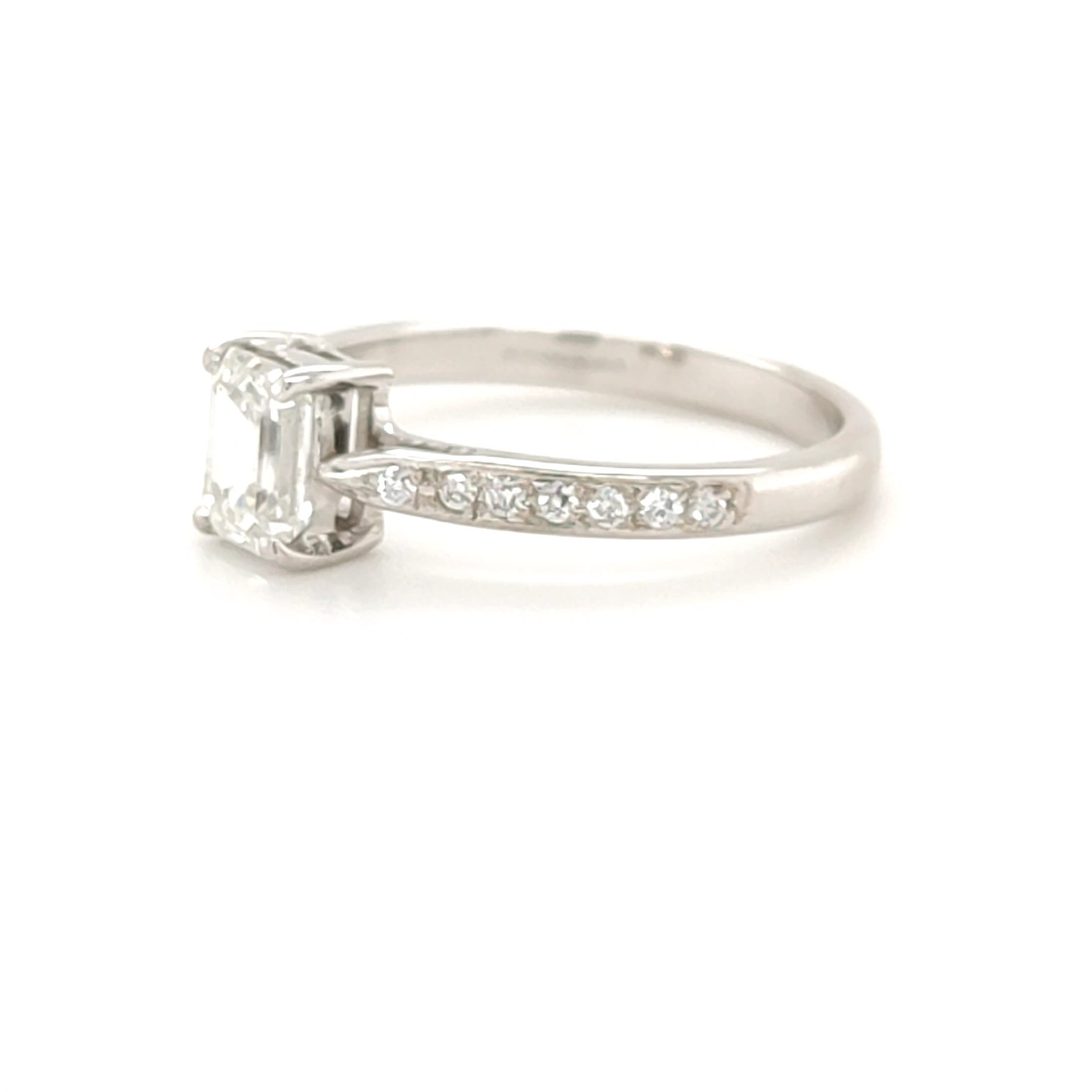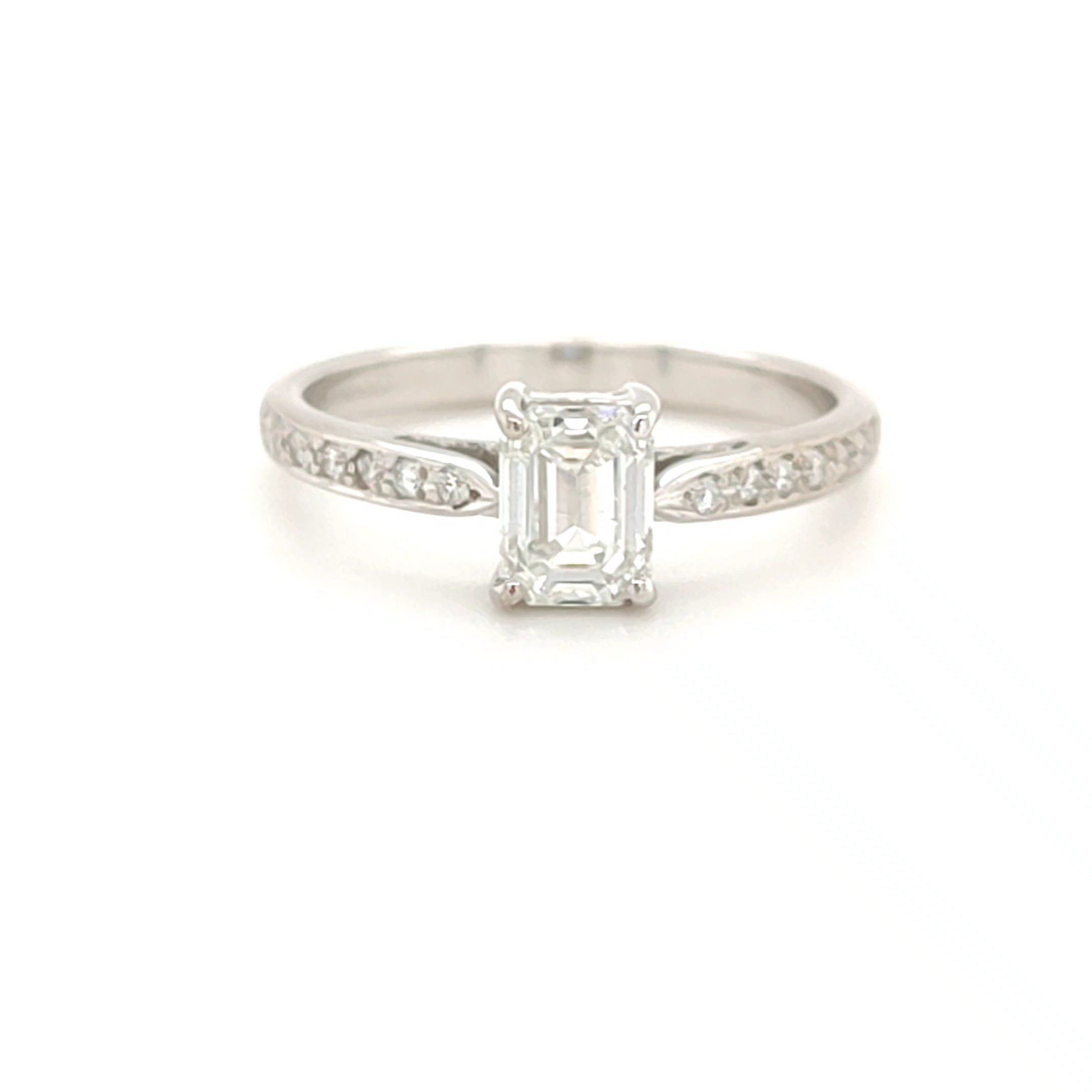 This stunning emerald cut Diamond has been set in a simple four claw setting and is complimented by the brilliant cut diamonds set to each shoulder.