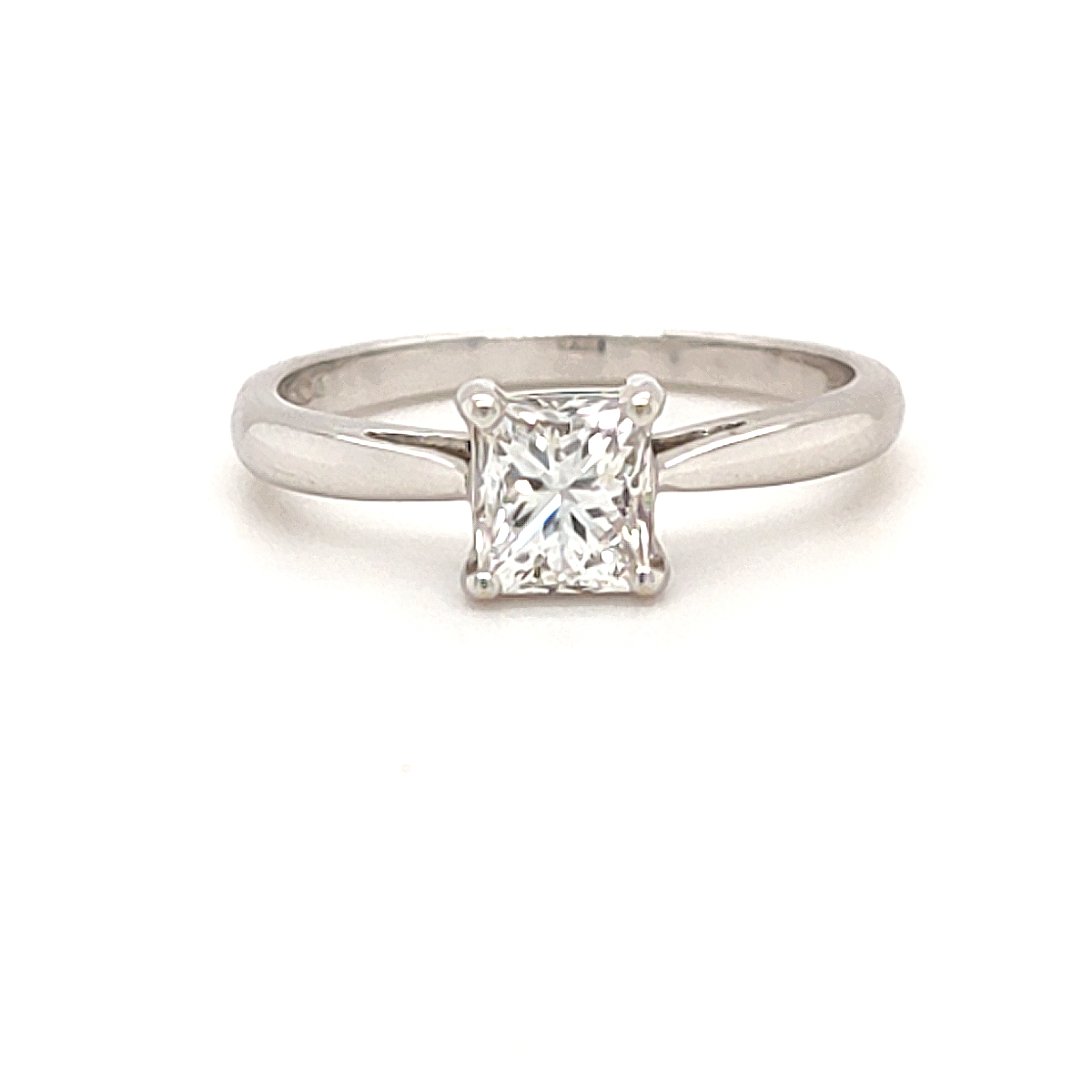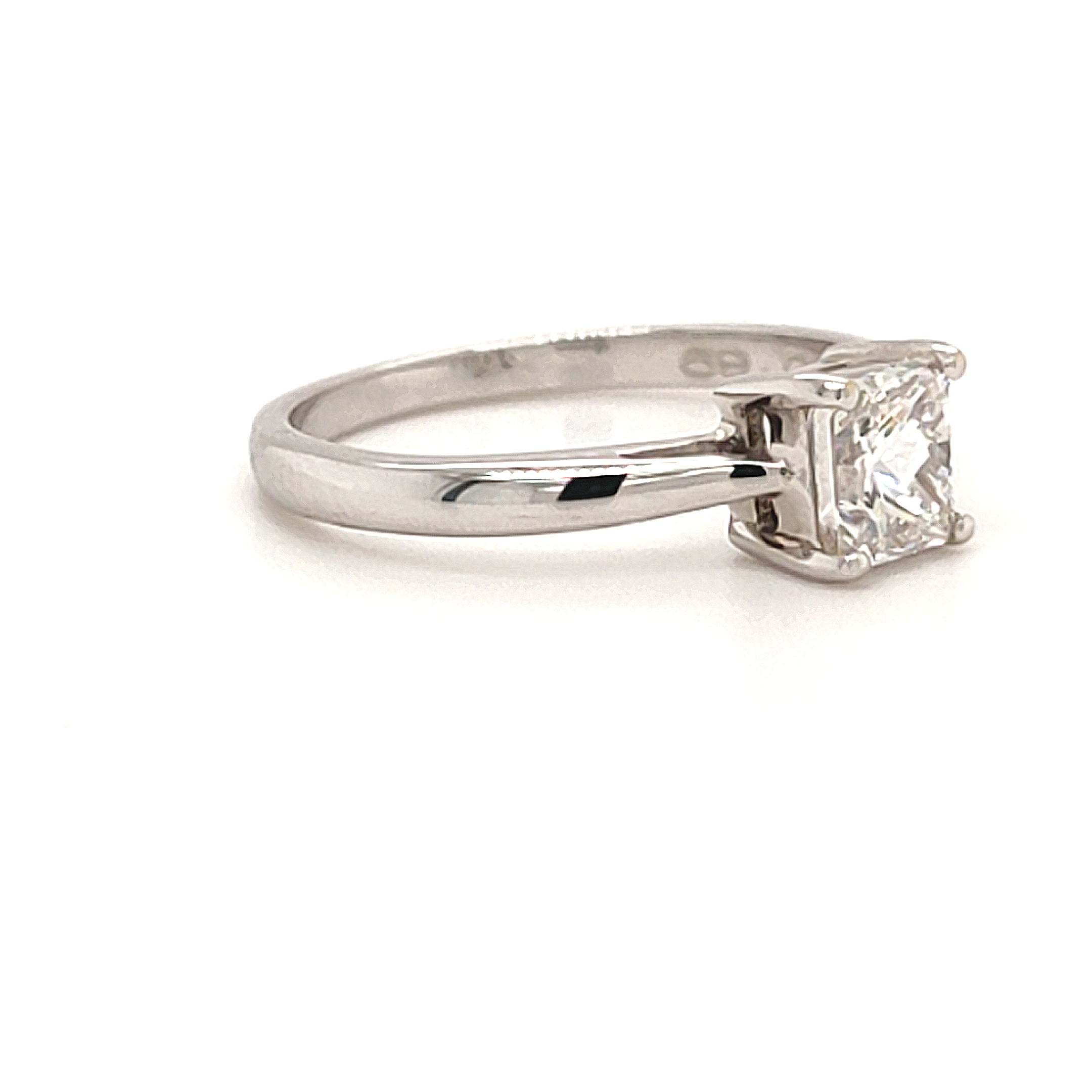 This beautiful 0.89ct Princess cut Diamond has been set in a substantial four claw mount with a “D” shape shank, tapering shoulders and double gallery.