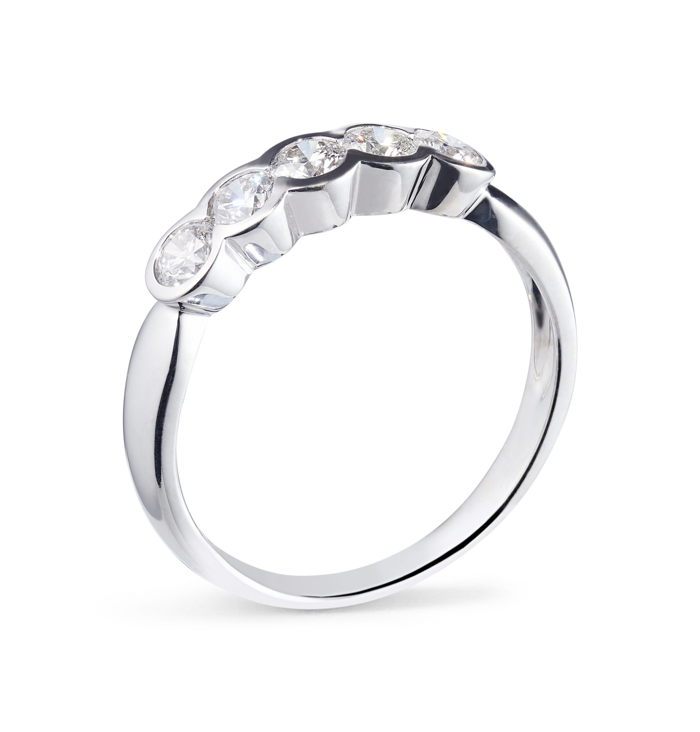 Our 1.12ct 18ct white gold 5 stone rub-over ring is set with brilliant cut diamonds.