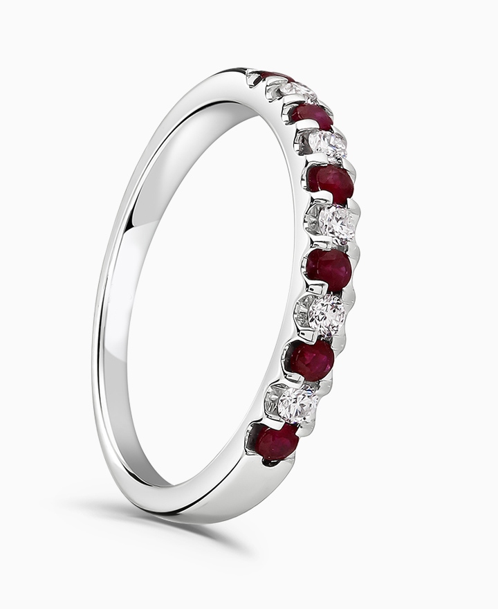 Six individually selected Rubies have been interspersed by 5 brilliant cut Diamonds in claw settings in 18ct white gold settings with a court interior.