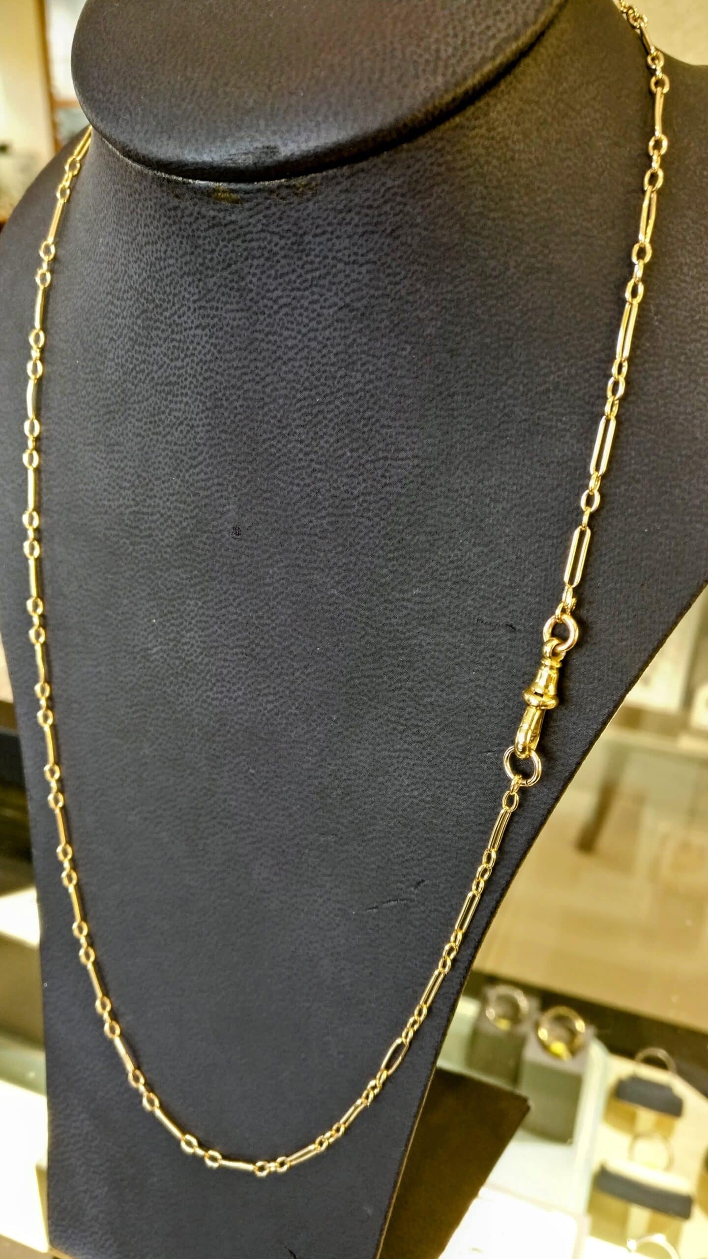 This pre-owned 18ct yellow gold necklace has a paper link style design, measuring 22″ with an albert swivel clasp.