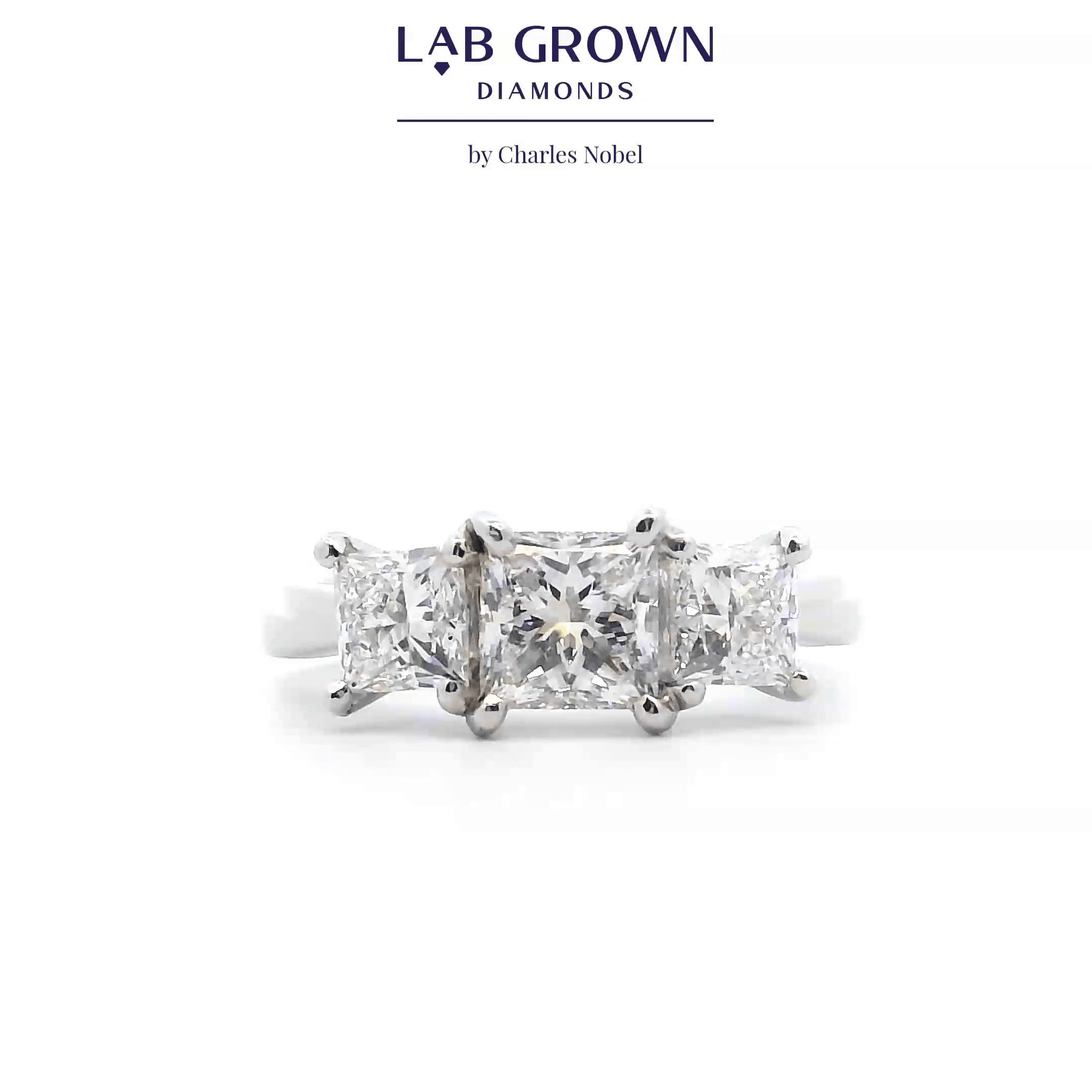 This stunning engagement ring features a trio of princess cut lab-grown diamonds, totaling 2.13 carats, set in a sleek platinum band.
