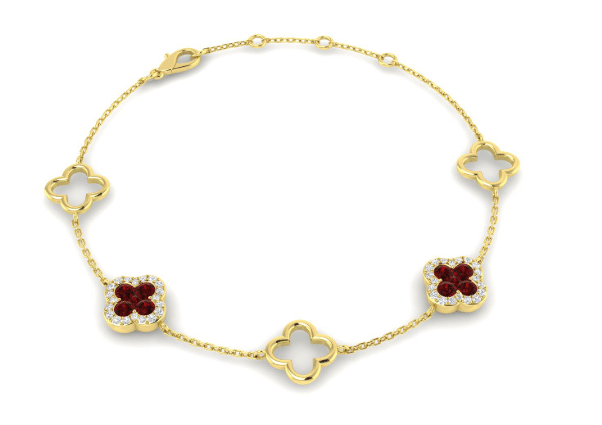 The alternating open clover motifs and ruby-and-diamond clusters create a harmonious blend of elegance and charm.