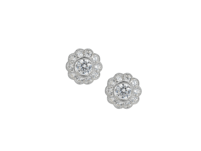 A 9mm diameter round cluster head with a central 4.5mm cubic zirconia and surrounded by 10 small round cubic zirconia with a milgrain edging. Matching necklace is also available.