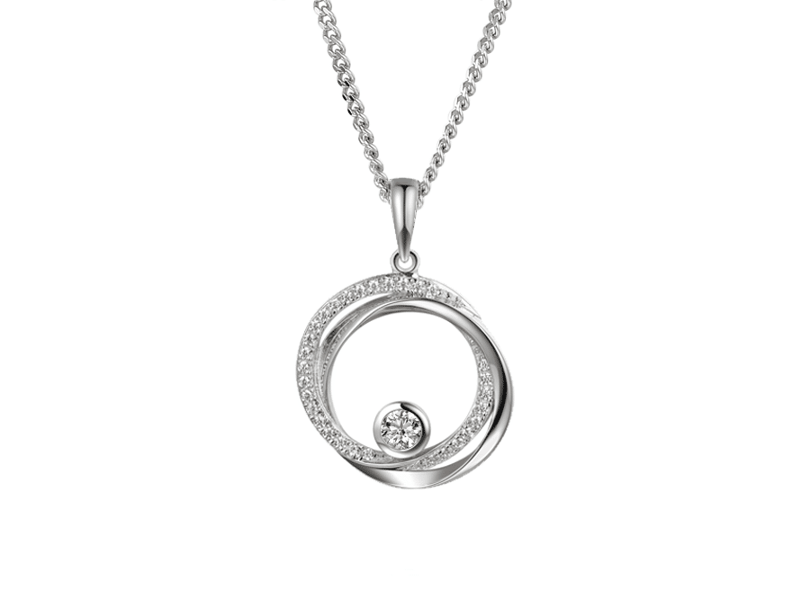 This elegant design blends a circle of silver with a circle of sparkling cubic zirconia and a single round sparkling cubic zirconia. This classic necklace has been given an update to create a contemporary piece with an outcome that gives the ‘wow’ factor. This necklace is 22mm long including the loop and 16mm in diameter. The round 3mm cubic zirconia is surrounded by a rub over setting and circled by cubic zirconia