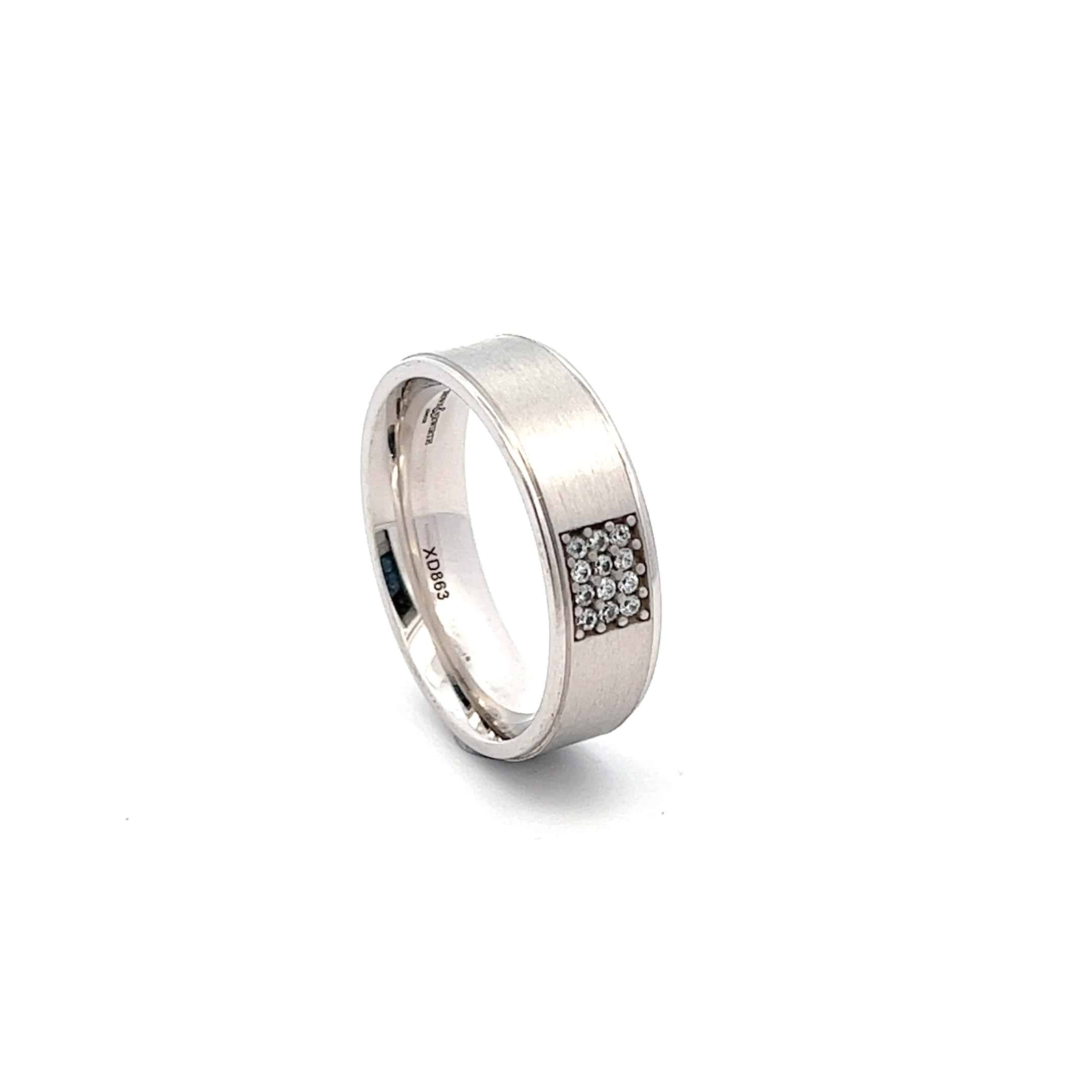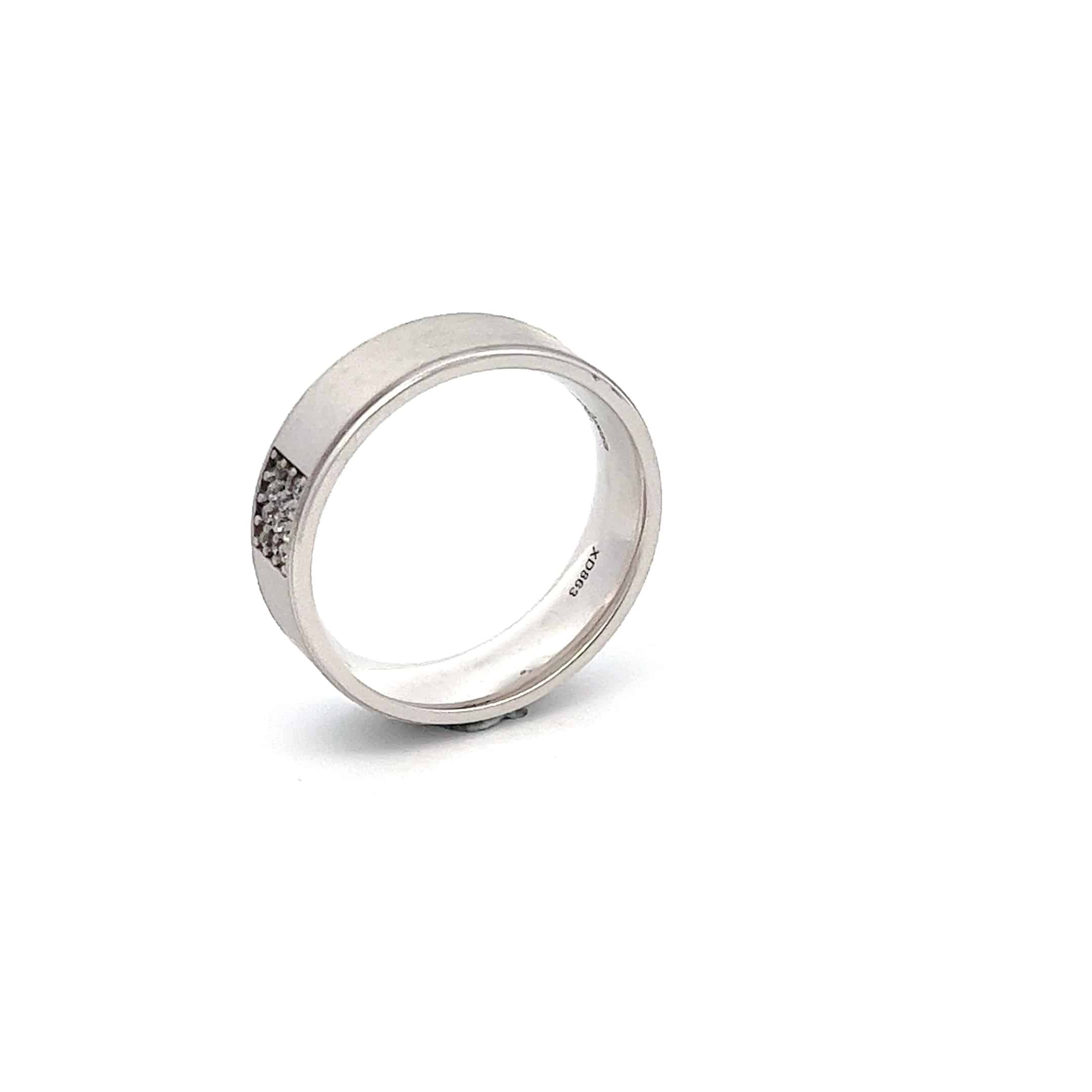 Handcrafted ; Â a grid of round brilliant cut diamonds set atop a contrasting finish with polished rolled edges, presented on a flat top band. Total carat weight 0.08ct