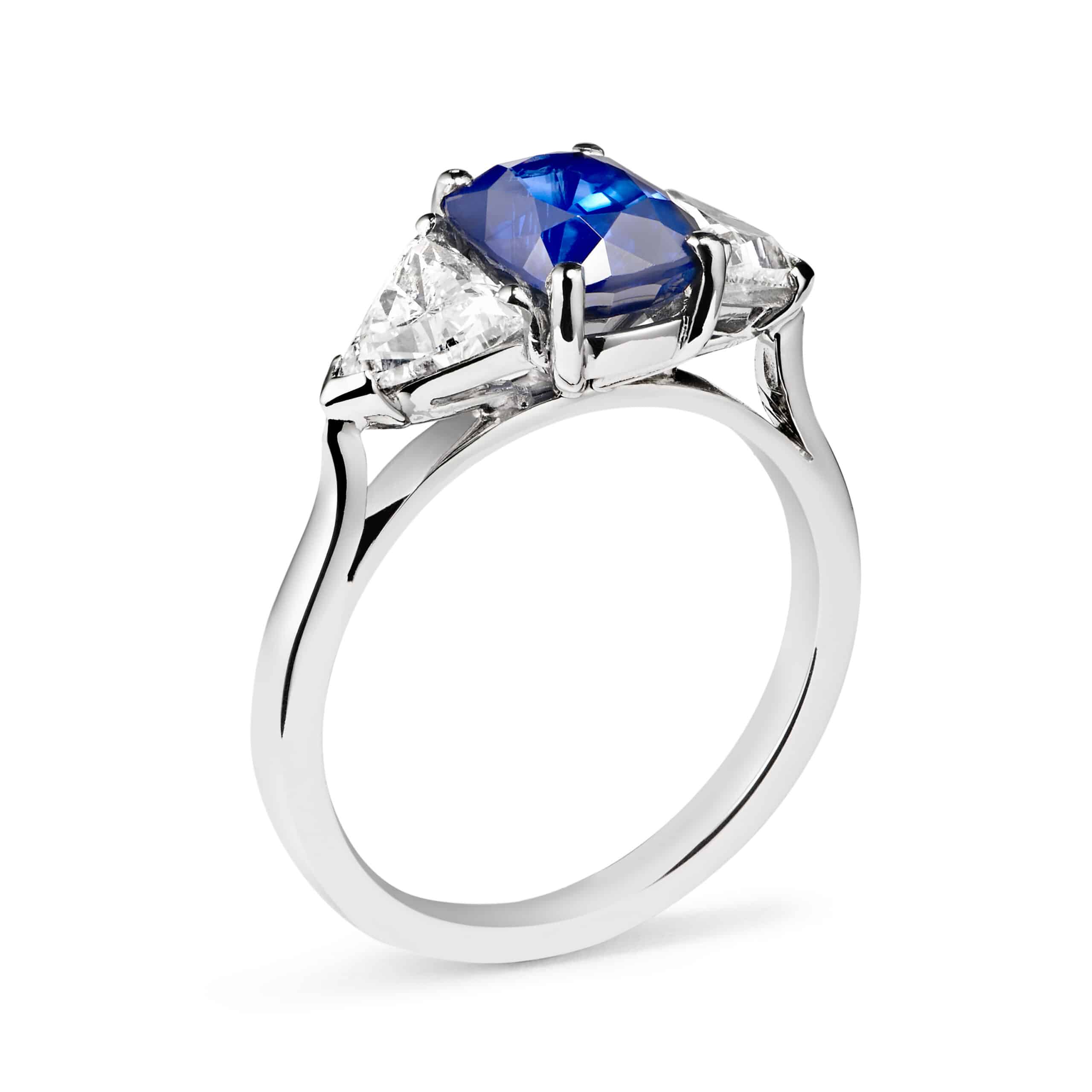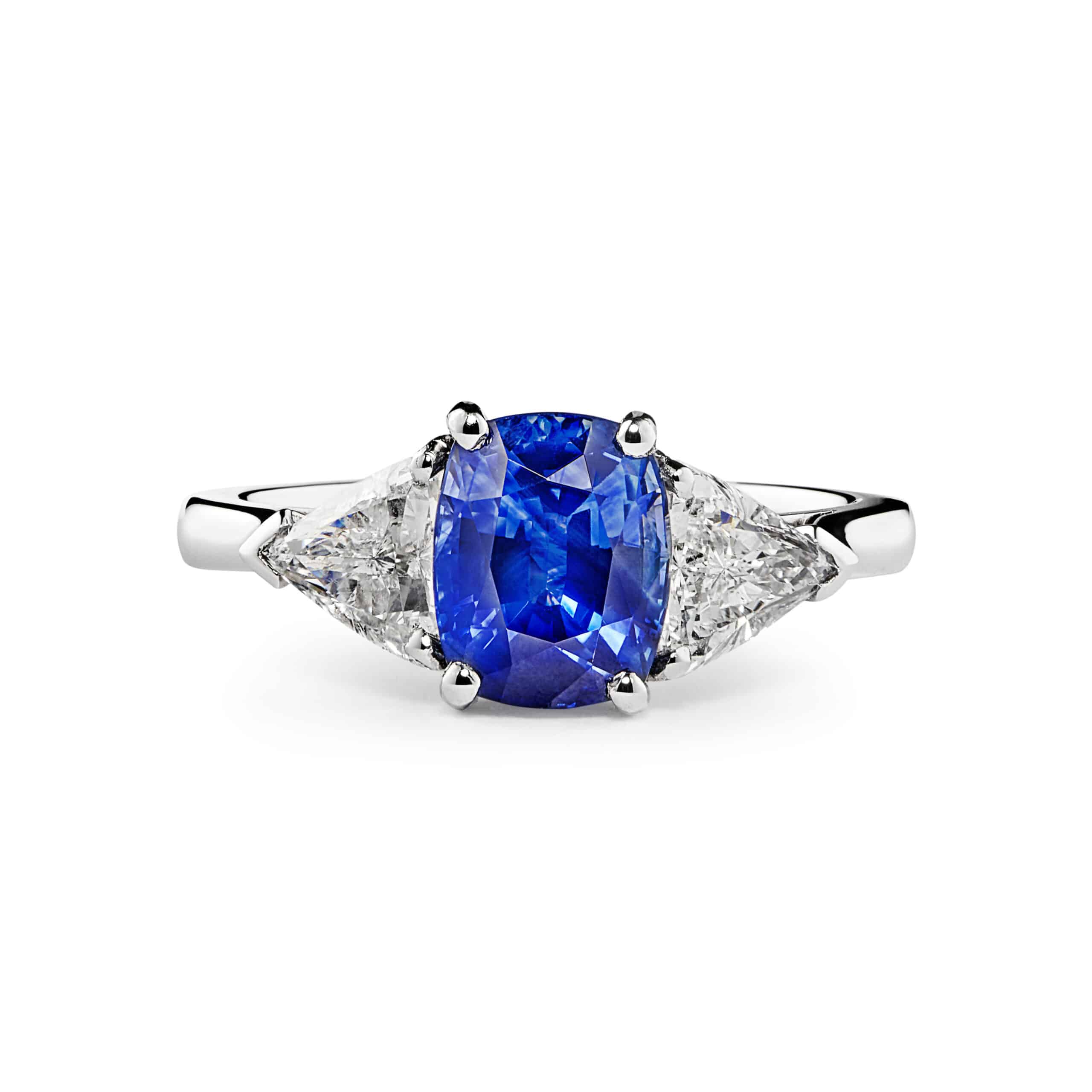 A refined expression of elegance and craftsmanship, this stunning trilogy ring features a vibrant 2.56ct cushion-cut sapphire, flanked by two dazzling 1.06ct trilliant-cut diamonds.