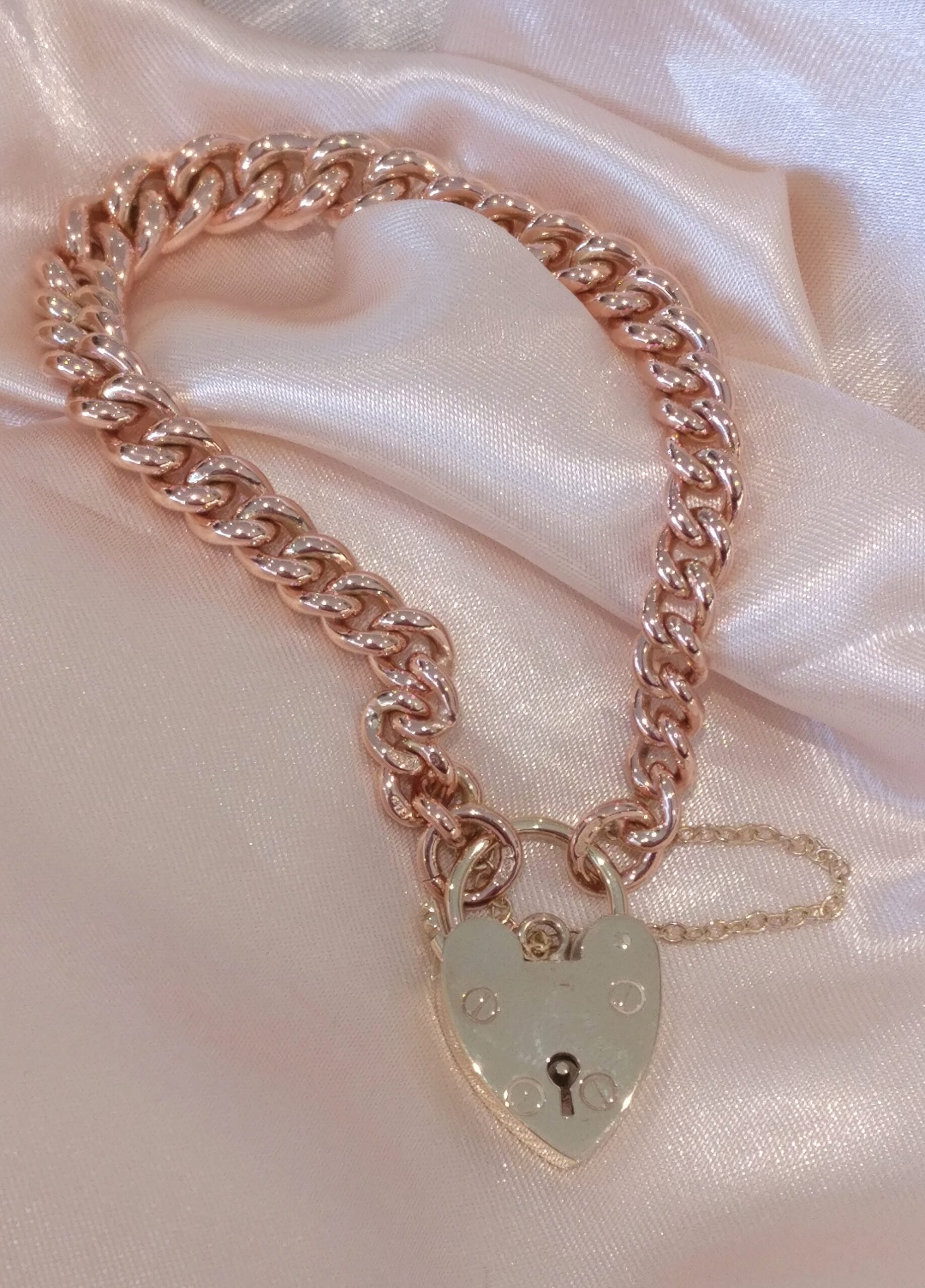 The Beautiful high shine of this 9ct Rose Gold curb Bracelet with a 9ct yellow gold heart padlock and safety chain would suit any occasion.