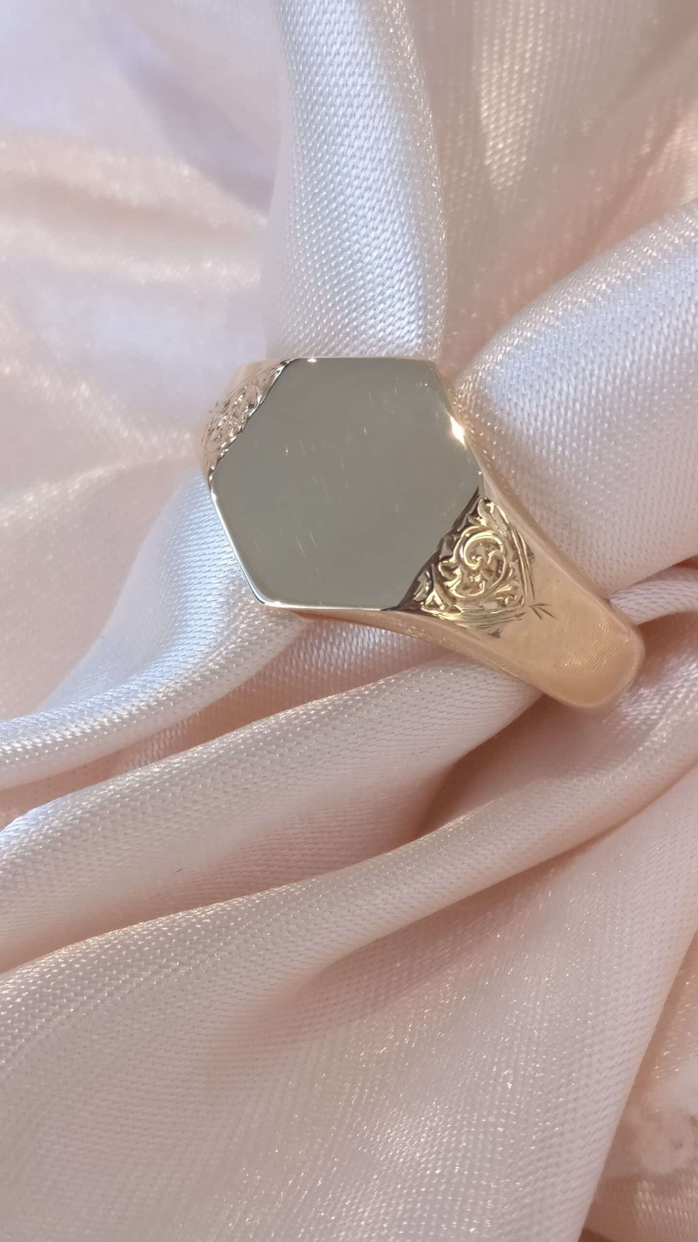 This pre-owned 18ct yellow gold signet ring in an unusual hexagonal design and scroll detail. The ring size measures