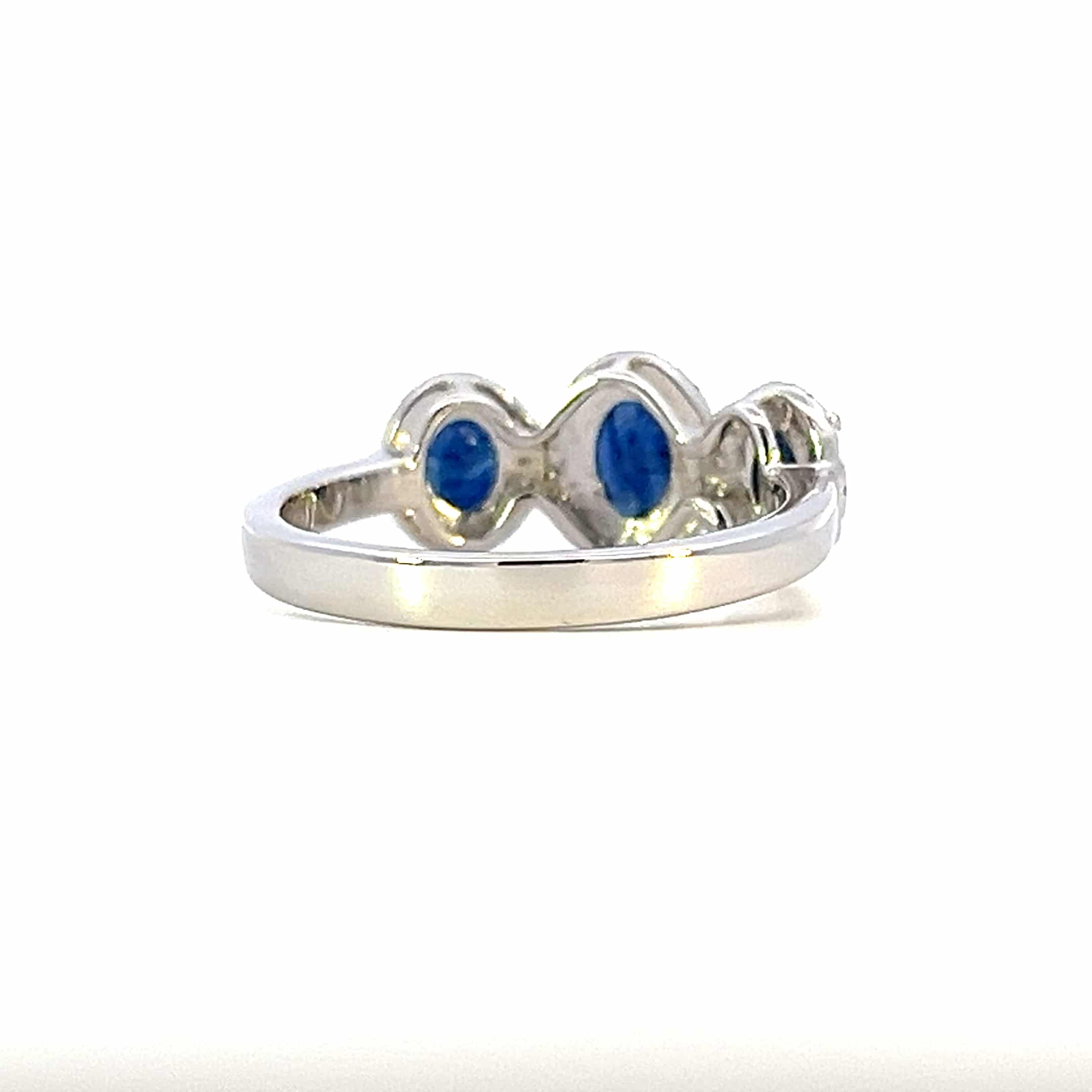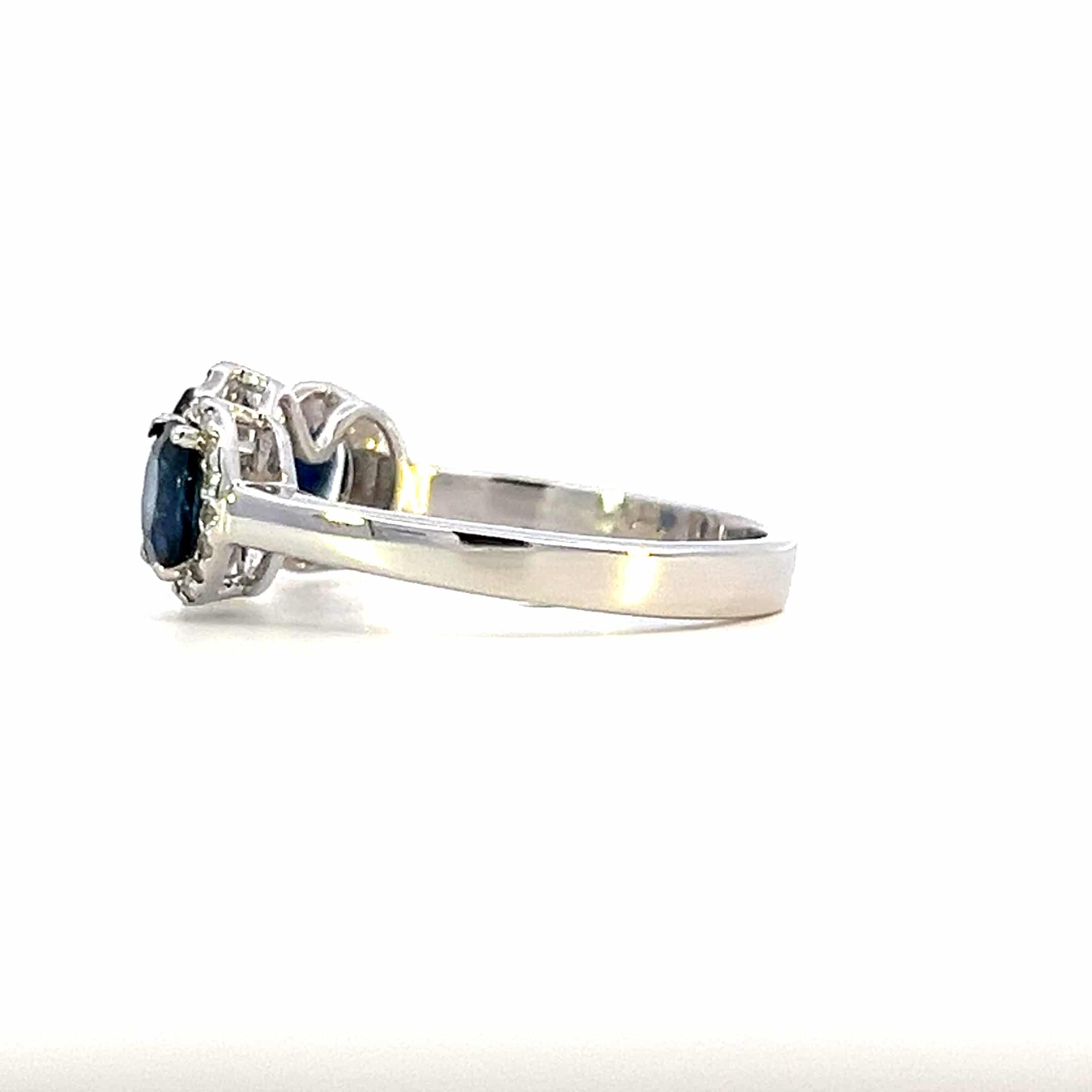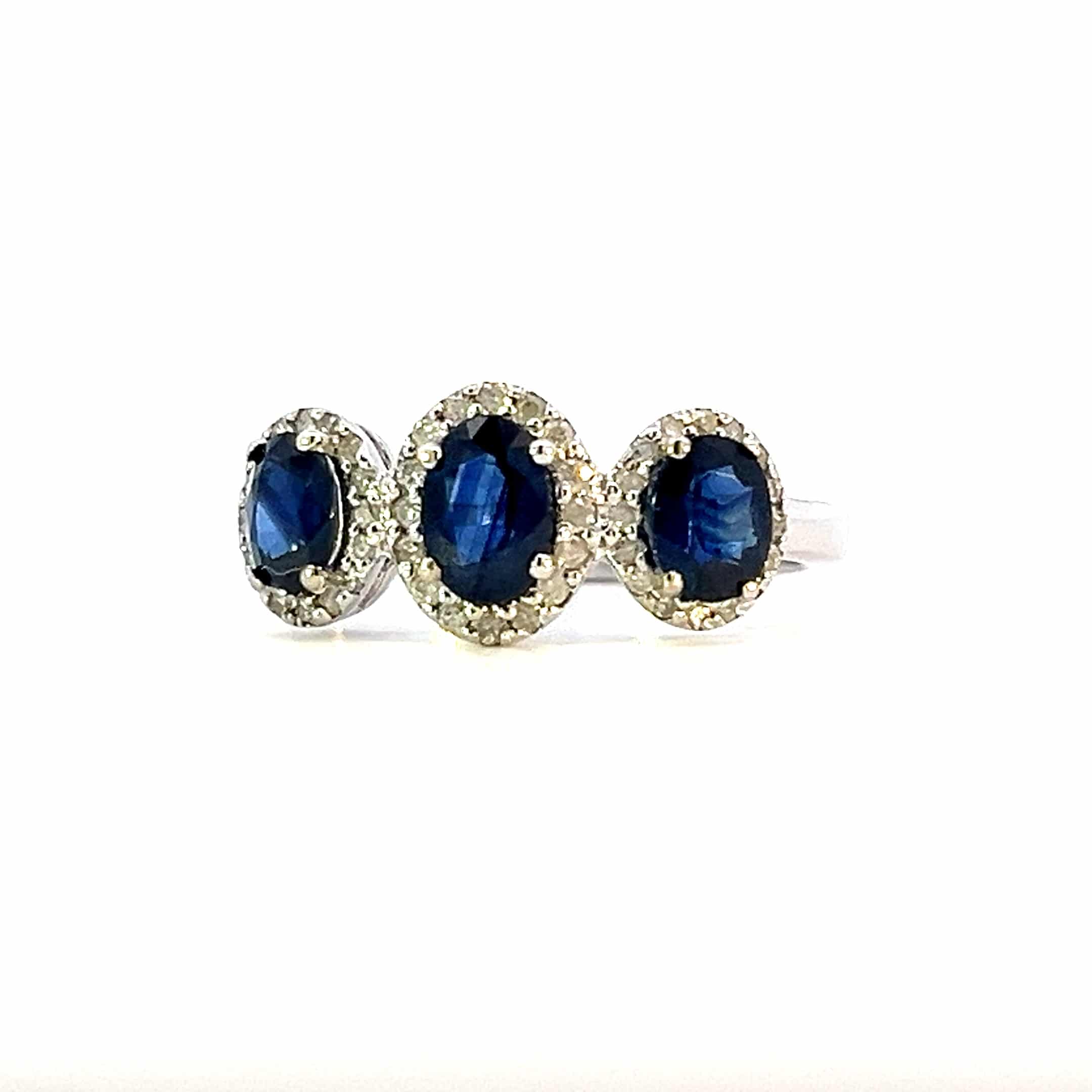 This exquisite ring features three stunning oval-cut sapphires, each encircled by a halo of sparkling diamonds.