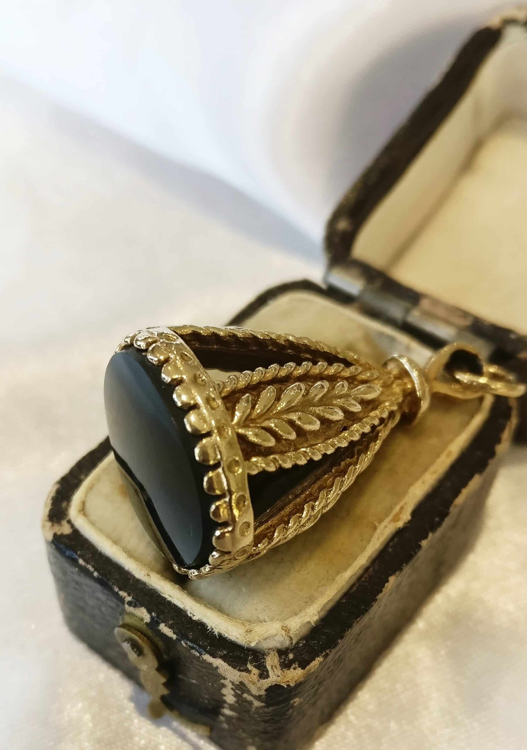 This unusual pre-owned pendant / fob charm has an intricate leaf design with a black onyx stone set in the base of the charm.
